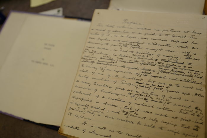 The well-worn small green leather folder contains around a hundred looseleaf items, most of them handwritten jottings for his slide lectures about Jutland. We know that Howdill visited Jutland in 1911 – but since none of the notes contains a date, we can’t be sure which of them were taken down on his Danish trip, and which were written up afterwards. That same year, the prominent English man of letters Edmund Gosse published his travel memoir Two Visits to Denmark, 1872 and 1874 (London: Smith, Elder & Co, 1911). Howdill copied out a short passage of description from the Gosse book, which may well have inspired him to head to Denmark himself (by an odd coincidence, the original manuscript of Two Visits to Denmark now forms part of the extensive Gosse archives held by the Brotherton Library’s Special Collections at the University of Leeds – see the picture below).